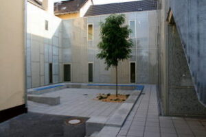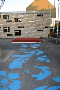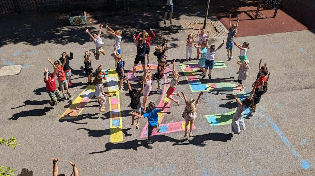 Das offene Atrium ist der Mittelpunkt der Schule. Bei gutem Wetter finden in diesem Outdoor-Klassenzimmer zum Bespiel gemeinsame Unterrichtsreflexionen statt oder das Schülerparlament tauscht sich über gemeinsame Themen aus. Auch das Erwachsenen-Schulteam trifft sich gerne bei gutem Wetter für eine Pause im Atrium. Der wunderschöne Blick auf den Rhein zieht jeden Menschen an und schafft ein Gefühl von Gemeinschaft, Zusammenhalt und Stärke. Gemeinsam gefeiert wurde hier übrigens auch schon 😉.